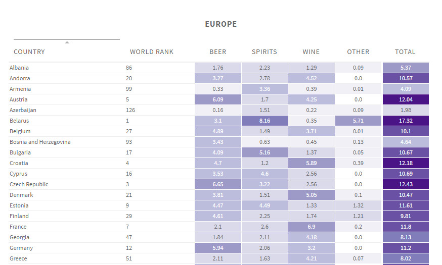 Με βάση τα επίσημα στοιχεία του Παγκόσμιου Οργανισμού Υγείας και του World Bank datasets, ο Matt Stiles, παρουσίασε στο thedailyviz.com τις λίστες με τις χώρες που οι κάτοικοί τους καταναλώνουν περισσότερο αλκοόλ στον κόσμο.