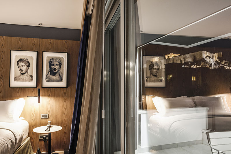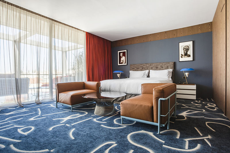 Στα δωμάτια και στις σουίτες, έπιπλα που συνήθως σήμερα τα περιγράφουμε ως «modern classics», όπως είναι για παράδειγμα οι πολυθρόνες LC3 που σχεδίασε το 1928 ο Le Corbusier, το περίφημο ντιβάνι της Eileen Gray (1925), ή το εκπληκτικό τραπεζάκι καθιστικού που σχεδίασε ο Warren Platner το 1966, συνδυάζονται άψογα με πιο σύγχρονες δημιουργίες του διεθνούς design προσθέτοντας στο σύνολο ζωηρές νότες που εκπλήσσουν και εντυπωσιάζουν.