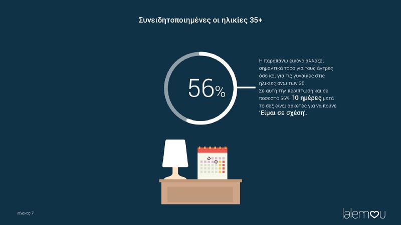 Η παραπάνω εικόνα αλλάζει σημαντικά τόσο για τους άντρες όσο και για τις γυναίκες στις ηλικίες άνω των 35. Σε αυτή την περίπτωση και σε ποσοστό 56%, 10 ημέρες μετά το σεξ είναι αρκετές για να πούνε «Είμαι σε σχέση» !
