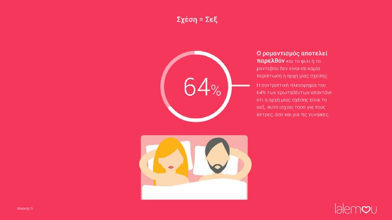 Ο ρομαντισμός αποτελεί παρελθόν και το φιλί ή το ραντεβού δεν είναι σε καμία περίπτωση η αρχή μίας σχέσης. Η συντριπτική πλειοψηφία του 64% των ερωτηθέντων απαντάνε ότι η αρχή μίας σχέσης είναι το σεξ. Αυτό ισχύει τόσο για τους άντρες, όσο και για τις γυναίκες.