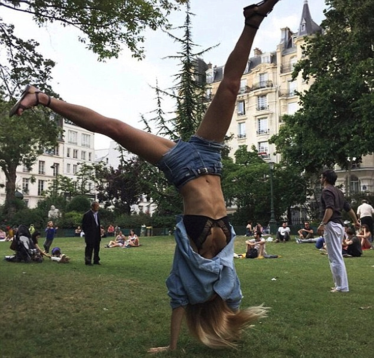 Φορώντας ένα καυτό τζιν σορτσάκι το σούπερ μοντέλο έκανε ακροβατικά πάνω στο χορτάρι με αποτέλεσμα να φανεί το μαύρο εσώρουχό της.