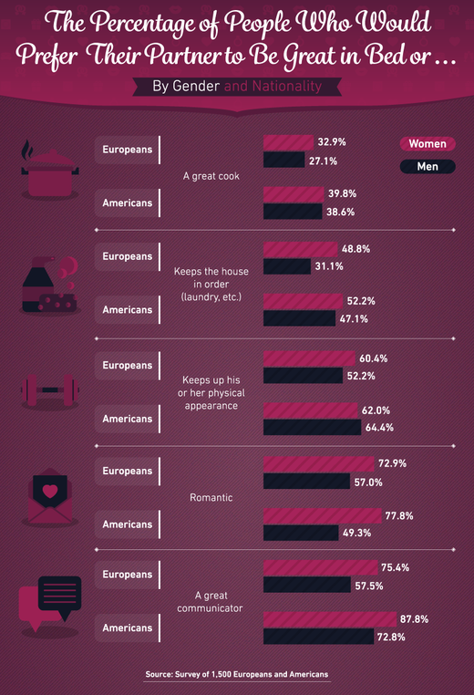 Όπως φαίνεται και στο infographic (εικόνα κάτω), ένα σχεδόν απίστευτο ποσοστό της τάξης του 88% των Αμερικανίδων και ένα 75% των Ευρωπαίων γυναικών δήλωσαν ότι προτιμούν να βγουν με κάποιον που είναι καλός στην επικοινωνία παρά στο κρεβάτι. Κι ενώ για τους Αμερικανούς έχει αντίστοιχη σημασία σε ποσοστό 73%, οι Ευρωπαίοι άντρες δεν νοιάζονται τόσο για το επικοινωνιακό κομμάτι, παρόλο που το 57% δηλώνει ότι προτιμά μια γυναίκα που έχει ωραία επικοινωνία παρά τη δράση στο κρεβάτι.