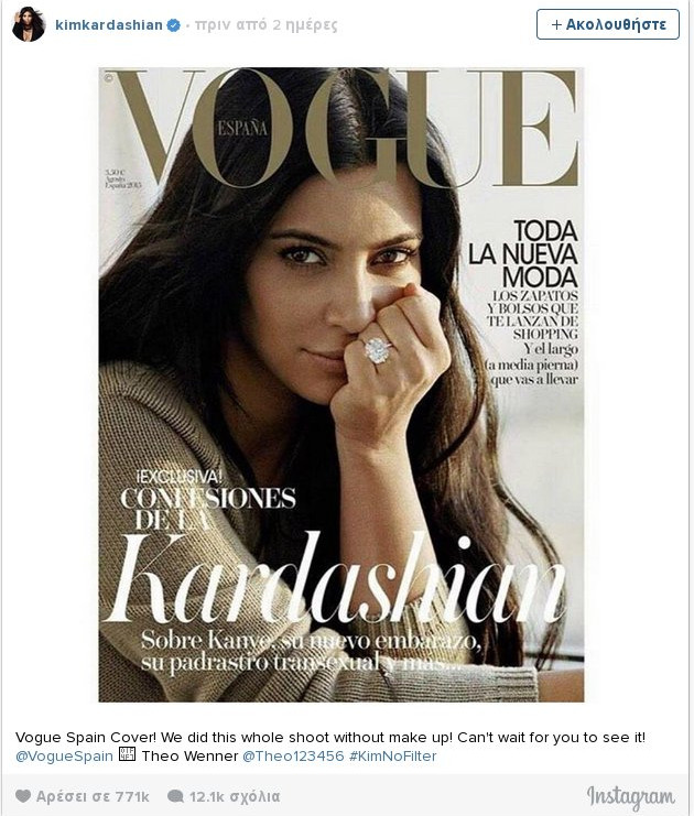H Kim ανέβασε πρόσφατα στον λογαριασμο της στο instagram το εξώφυλλο της ισπανικής Vogue όπου (όπως λέει η ίδια και ο μακιγιέρ της) πόζαρε χωρίς μακιγιάζ. Αλλά ποιος την πιστεύει;