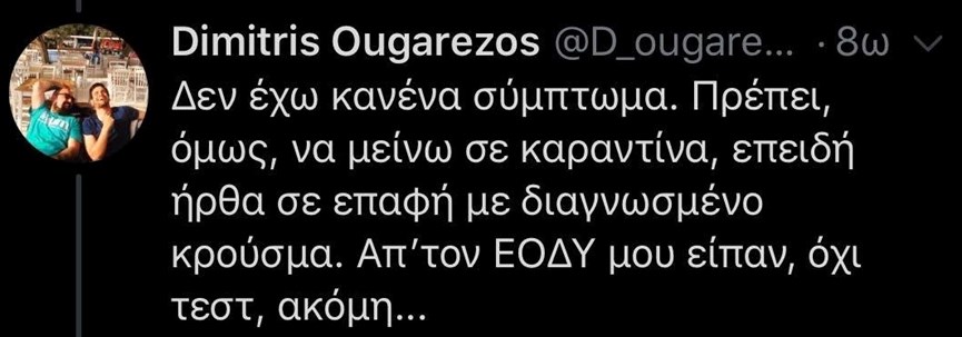 «Δεν έχω κανένα σύμπτωμα, πρέπει όμως να μείνω σε καραντίνα, επειδή ήρθα σε επαφή με διαγνωσμένο κρούσμα. Από τον ΕΟΔΥ μου είπαν όχι τεστ ακόμη» έγραψε ο Δημήτρης Ουγγαρέζος.