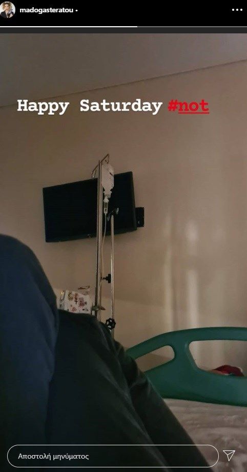 Η παρουσιάστρια και ραδιοφωνική παραγωγός του Ρυθμού 9,49 δημοσίευσε στον προσωπικό της λογαριασμό στο Instagram μια φωτογραφία, στην οποία φαίνονται τα πόδια της στο κρεβάτι του νοσοκομείου και στο βάθος ένας ορός.