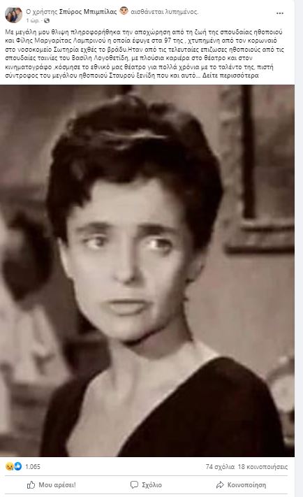 Τη θλιβερή είδηση ανακοίνωσε το πρωί της Τετάρτης ο Σπύρος Μπιμπίλας, ο οποίος έγραψε στο Facebook: «Με μεγάλη μου θλίψη πληροφορήθηκα την αποχώρηση από τη ζωή της σπουδαίας ηθοποιού και φίλης Μαργαρίτας Λαμπρινού η οποία έφυγε στα 97 της , χτυπημένη από τον κορονοϊό στο νοσοκομείο Σωτηρία εχθές το βράδυ. Ήταν από τις τελευταίες επιζώσες ηθοποιούς από τις σπουδαίες ταινίες του Βασίλη Λογοθετίδη, με πλούσια καριέρα στο θέατρο και στον κινηματογράφο, κόσμησε το εθνικό μας θέατρο για πολλά χρόνια με το ταλέντο της, πιστή σύντροφος του μεγάλου ηθοποιού Σταυρού Ξενίδη που και αυτός βρισκόταν μαζί της για πολλά χρόνια στο γηροκομείο Αθηνών.