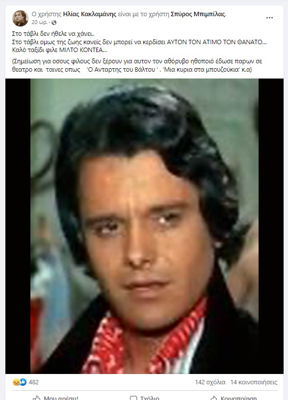 «Στο τάβλι δεν ήθελε να χάνει.. Στο τάβλι, όμως, της ζωής κανείς δεν μπορεί να κερδίσει αυτόν τον άτιμο τον θάνατο… Καλό ταξίδι, φίλε Μίλτο Κοντέα. (Σημείωση για όσους φίλους δεν ξέρουν για αυτόν τον αθόρυβο ηθοποιό, έδωσε το “παρών” σε θέατρο και ταινίες, όπως “Ο Αντάρτης του Βάλτου”, “Μια κυρία στα μπουζούκια” κ.α)», ανέφερε η ανάρτηση του Ηλία Κακλαμάνη.