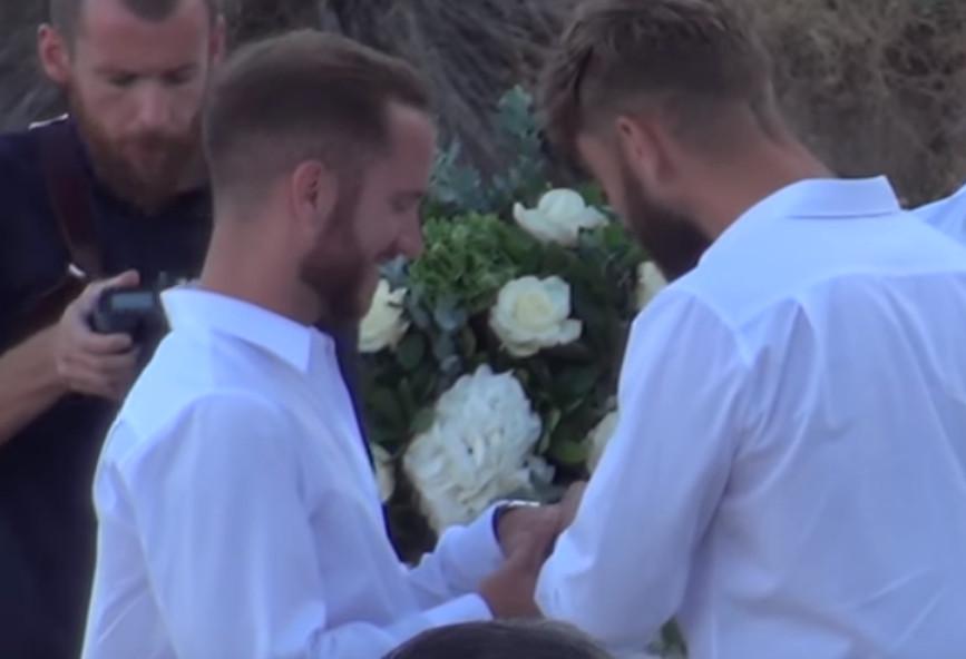 Τώρα το Mykonos Live Tv δημοσιεύει το βίντεο από τον πρώτο gay γάμο που έγινε στη Μύκονο. όπς θα δείτε στην τελετή βρέθηκαν περίπου 50 φίλοι του ζευγαριού, ενώ το ζευγάρ τήρησε ολα τα έθιμα του γάμου από τις βέρες μέχρι το πέταγμα της γαμήλιας ανθοδέσμης. Πάντως θυμίζουμε πως ο "γαμήλιος τουρισμός" παρουσιάζει εντυπωσιακή άνοδο σε Ελλάδα και Κύπρο, καθώς ζευγάρια (πλέον και gay) από κάθε γωνιά του κόσμου επιλέγουν τα όμορφα μεσογειακά τοπία ως το ιδανικό φόντο για τις γαμήλιες τελετές τους.